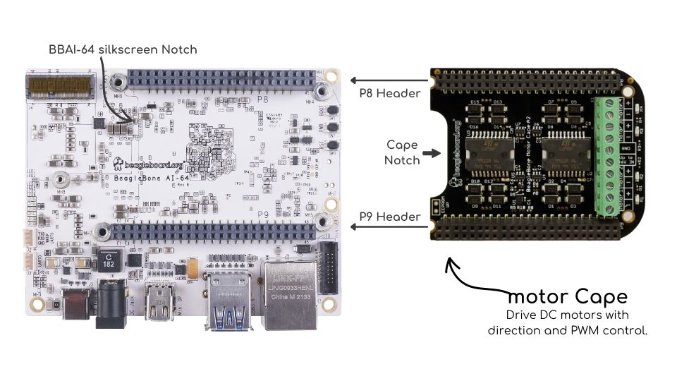 Beagle cape expansion interface on the BeagleBone AI-64 like other Beagles is comprised of two headers P8 (46 pin) & P9 (50 pin). All signals on the expansion headers are 3.3V unless otherwise indicated. On some of the cape header pins on AI-64 multiple SoC pins are shorted and only one of them should be used at a time. Information regarding the double/shorted pins is provided in the Pinout Diagrams above (simplified) and cape header pin tables below (detailed).