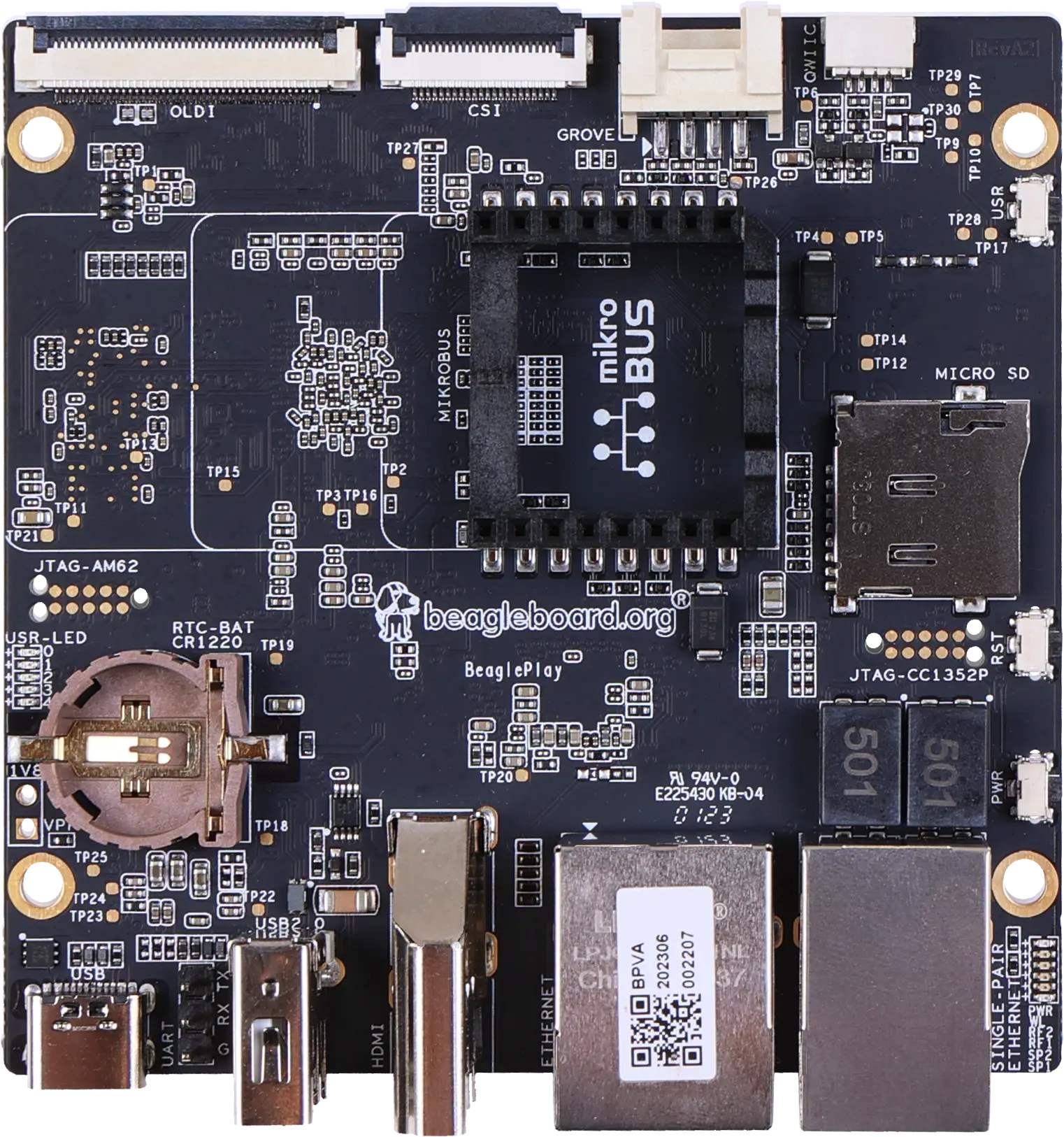 BeaglePlay is built around Texas Instruments AM62x Sitara™ Processors which is a Quad-Core Arm® Cortex®-A53 Human-machine-interaction SoC. It comes with 2GB DDR4 RAM, 16GB eMMC storage, Full size HDMI, USB-A host port, USB-C power & connectivity port, serial debug interface, and much more.