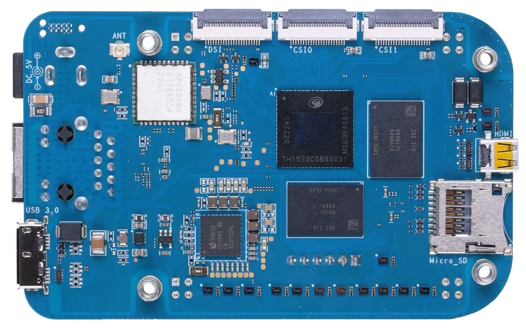 BeagleV-Ahead is built around T-Head TH1520 RISC-V SoC with quad-core Xuantie C910 processor clocked at 1.85GHz with a 4 TOPS NPU, support for 64-bit DDR, and audio processing using a single core C906.