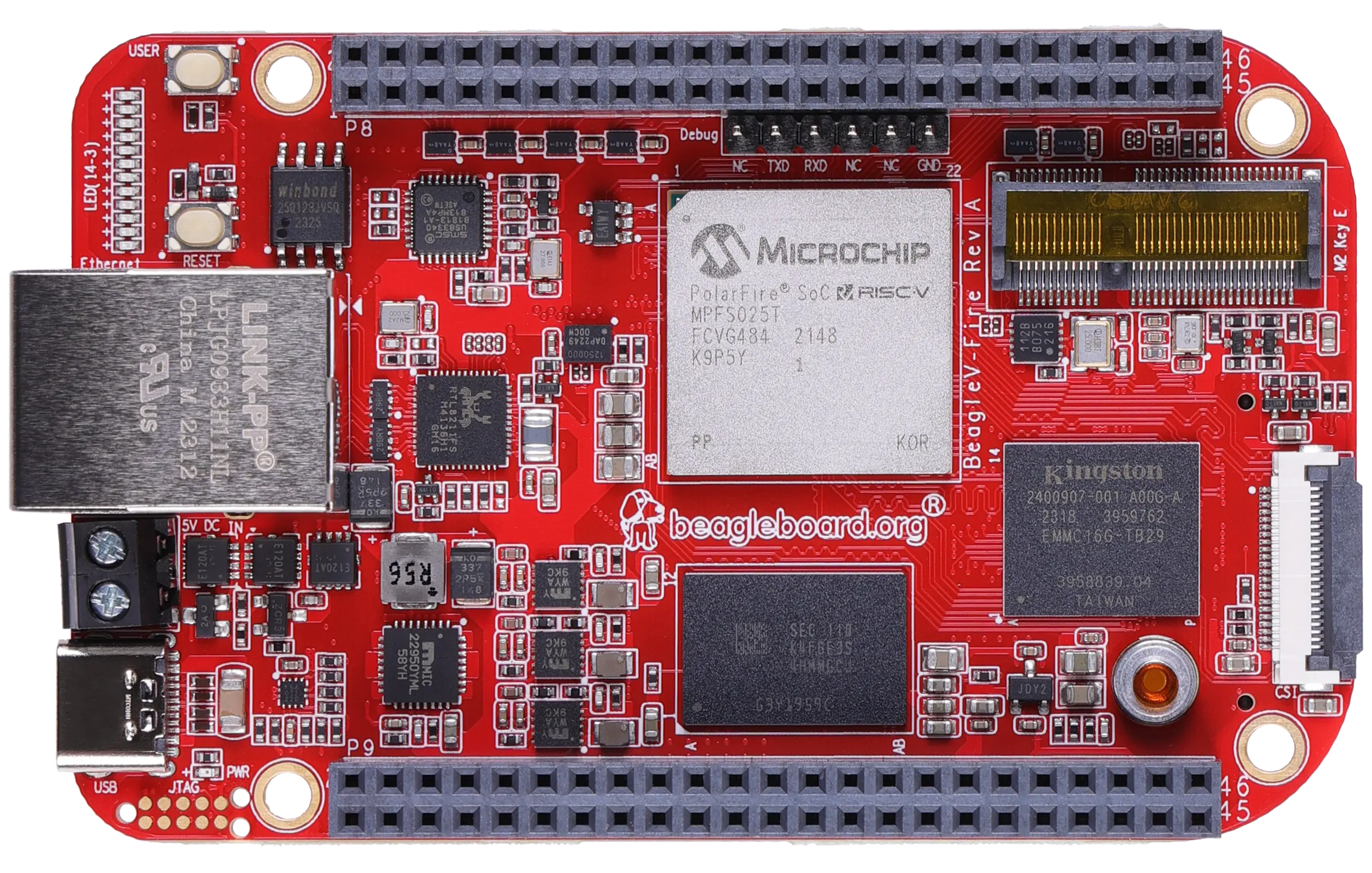 BeagleV®-Fire is a revolutionary SBC powered by the Microchip’s PolarFire® MPFS025T System on Chip (SoC) with 4x RV64GC Application cores, 1x RV64IMAC monitor/boot core, and FPGA fabric. BeagleV®-Fire opens up new horizons for developers, tinkerers, and the open-source community to explore the vast potential of RISC-V architecture and FPGA technology. It has the same P8 & P9 cape header pins as BeagleBone Black allowing you to stack your favourite BeagleBone cape on top to expand it’s capability. Built around the powerful and energy-efficient RISC-V instruction set architecture (ISA) along with its versatile FPGA fabric, BeagleV®-Fire SBC offers unparalleled opportunities for developers, hobbyists, and researchers to explore and experiment with RISC-V technology.
