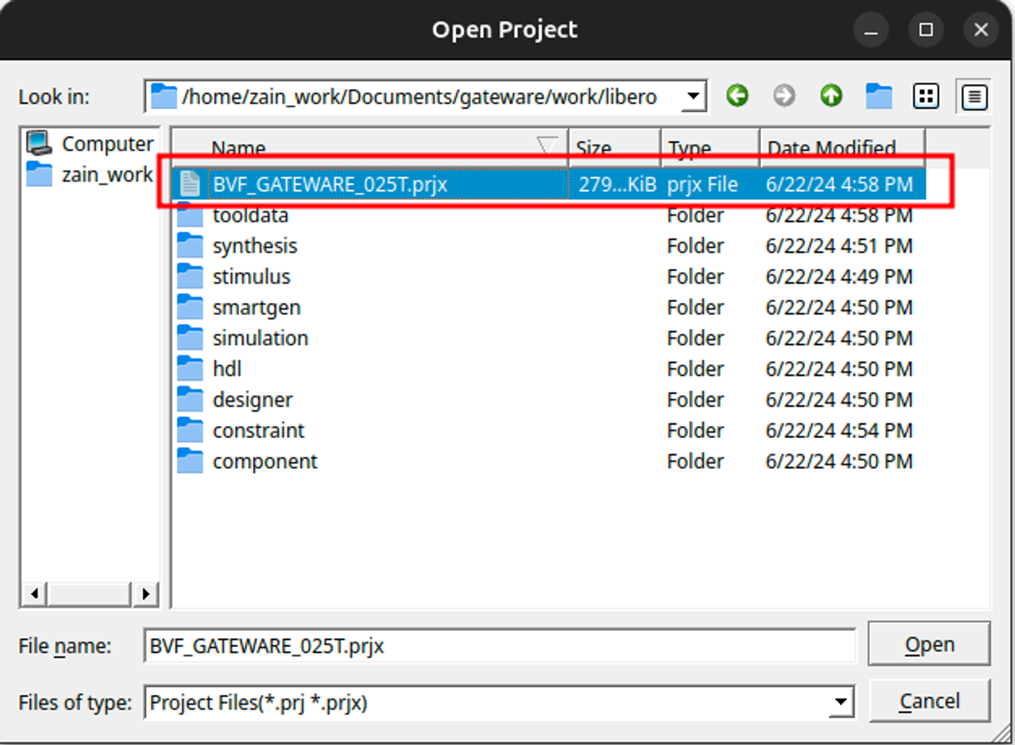 and selecting the generated project as gateware/work/libero/BVF_GATEWARE_025T.prjx