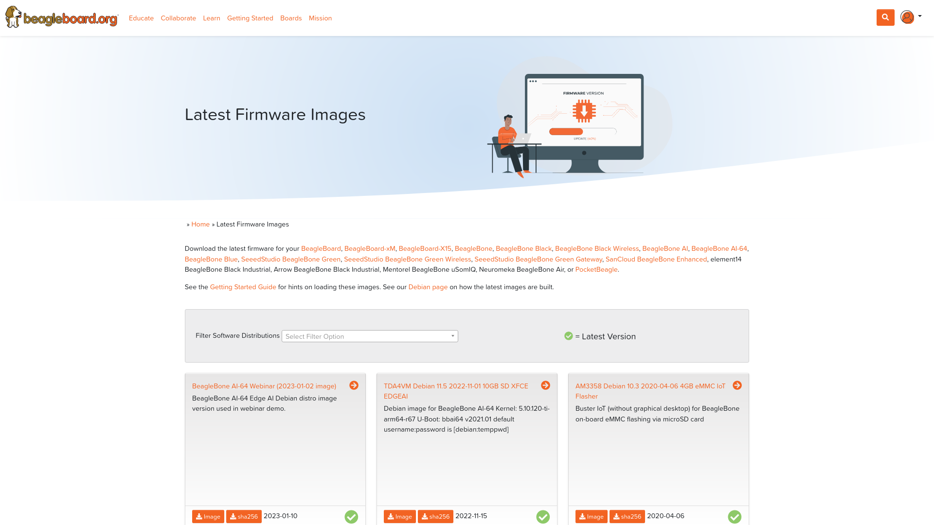 Download the latest software image from beagleboard.org distros page. The “IoT” images provide more free disk space if you don’t need to use a graphical user interface (GUI).